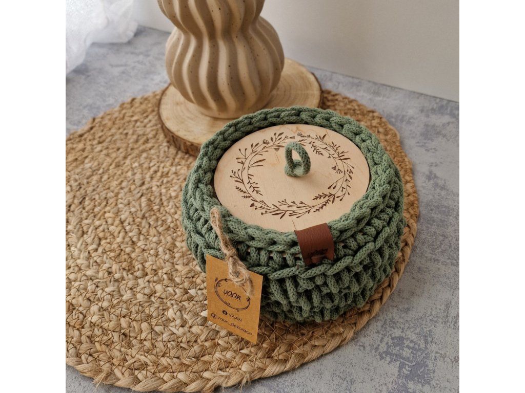 U všech háčkovaných produktů uvádím rozměr dřevěného dna, ze kterého vychází základ výrobku. Po uháčkování však hotový produkt mírně nabyde na objemu.